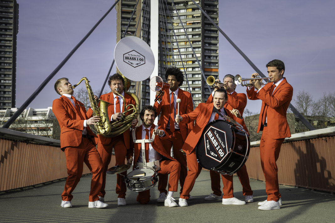 Stylisch in ihren roten Anzügen präsentiert die deutsche Band Brass2Go ein Allround-Paket, welches durch einzigartige Choreographien und handverlesene Show- und Comedyeinlagen, zu einem exklusiven Erlebnis wird.